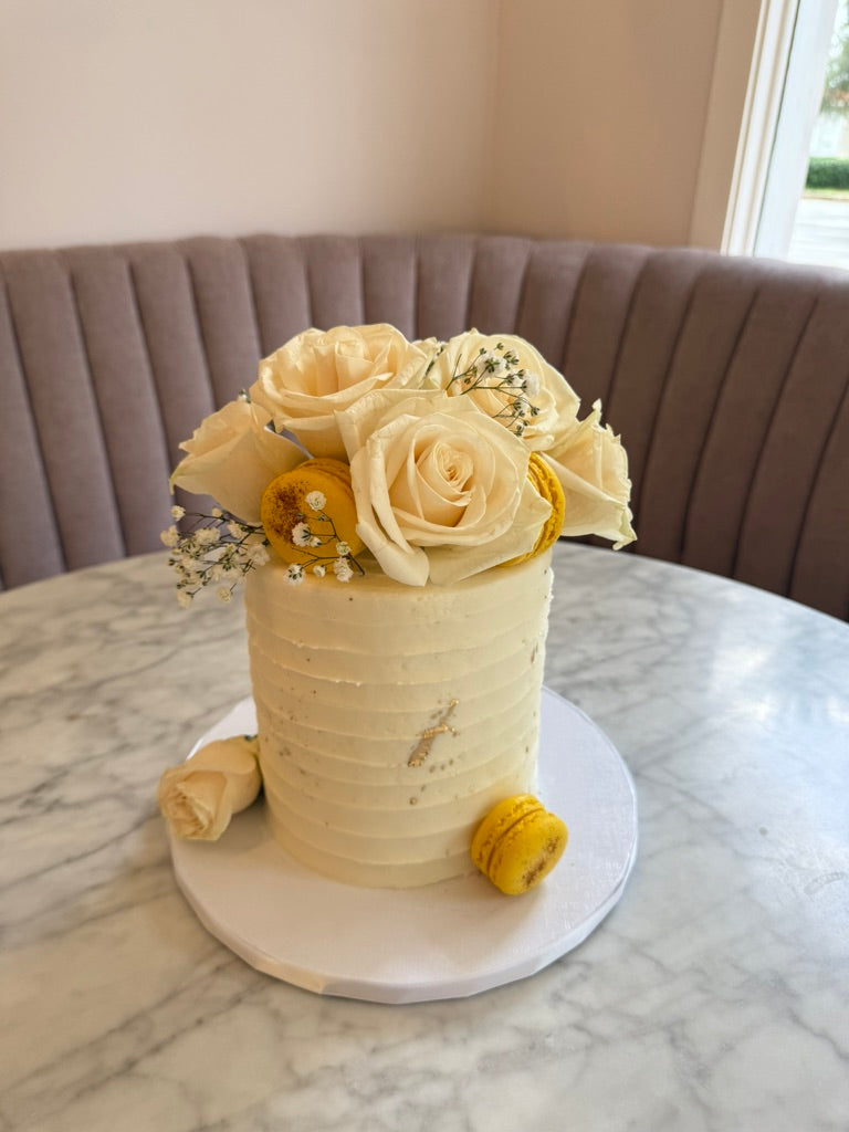 Indulge in a Garden of fresh roses, decorated with buttercream, some macarons a touch of gold and a personalized message on the board.
